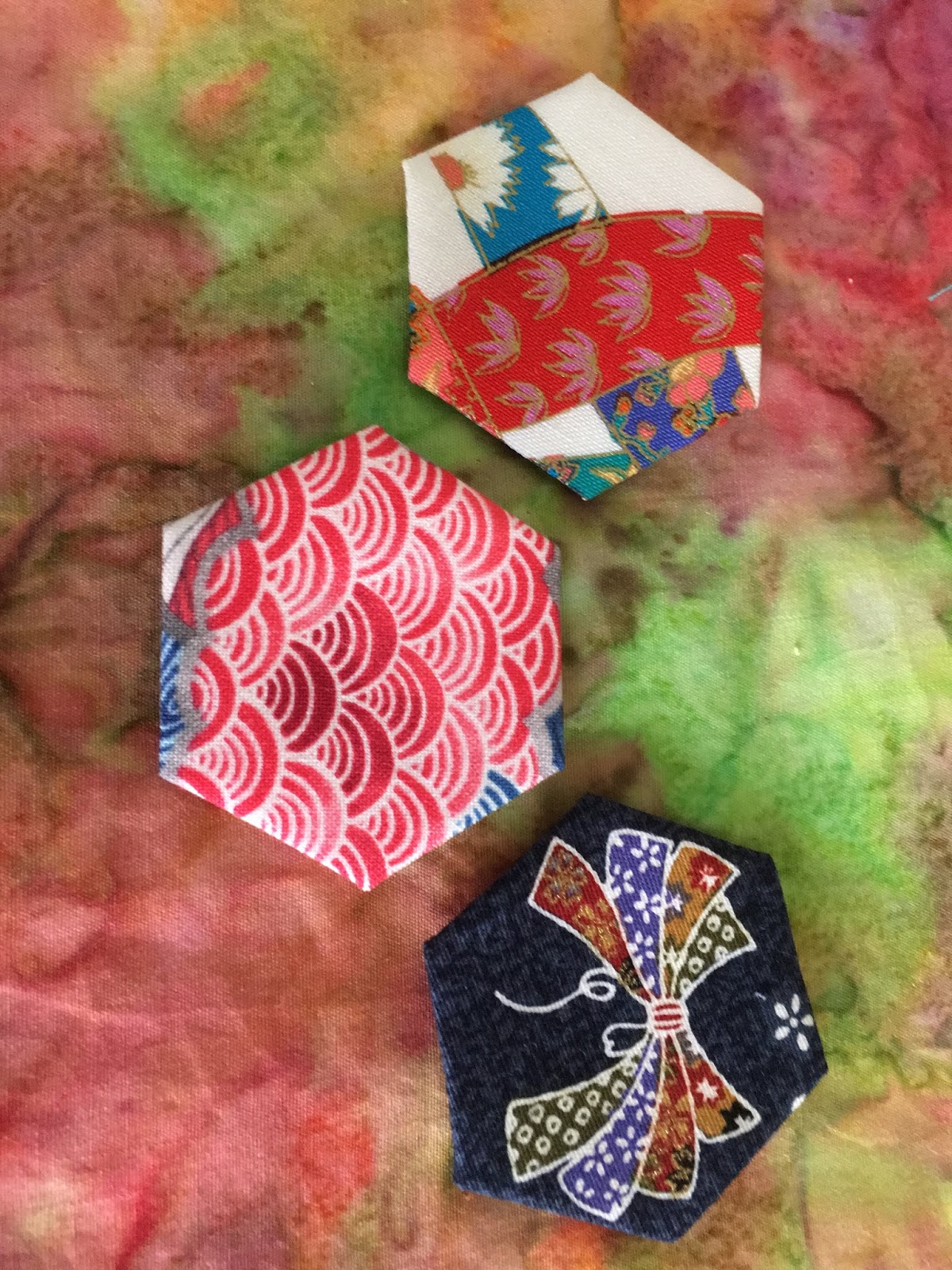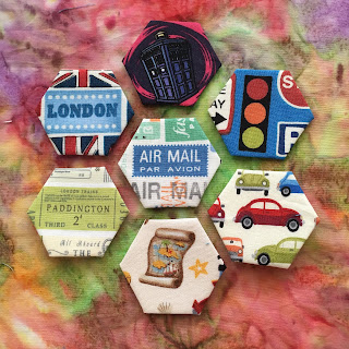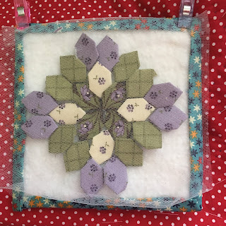 I'm still keeping up with with my Bramble Patch kit which has 0.5" honeycomb hexies and a 3rd square has been completed. What I have done to arrange the blocks before sewing is to make a mini design board 6" square made of mount board with wadding over. I used binding clips to clip fine net over the top to try and keep the pieces in place.