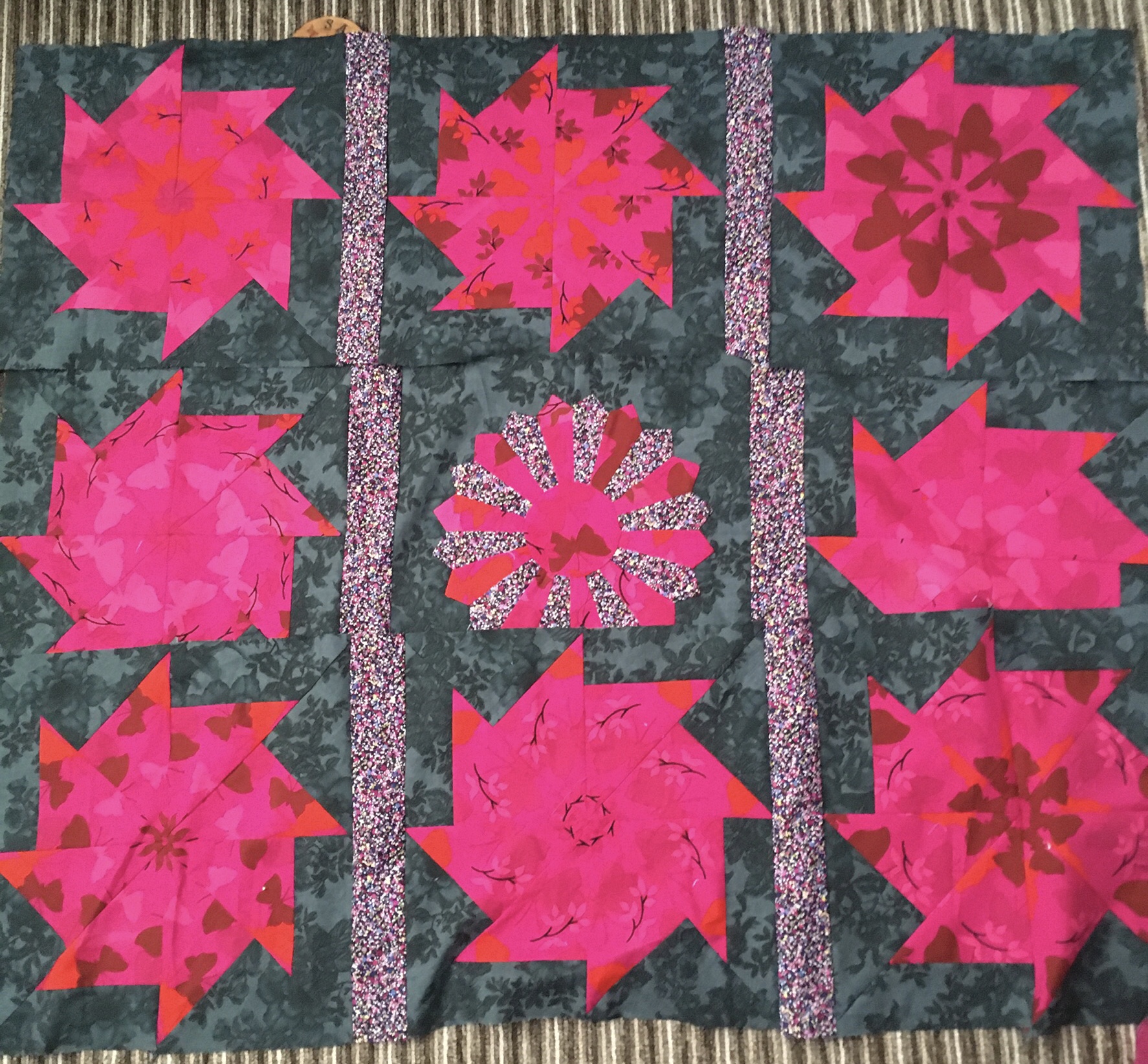 I'm pleased it'f finished and it looks really brilliant. It's single bed size and it may go to a charity, possibly Siblings Together, not sure at this point. I hope to tackle the black and pink quilt blocks next, but I'll have to get brain in gear for that one.