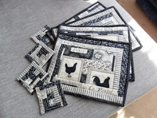 Last year on one of our several trips between Yorkshire and Dorset our stopping off point at the Bramble Patch in Weedon, Northamptonshire (exactly halfway) I saw this kit called Le Poulet in black and beige to make 4 placemats. Not only did I make these but also some coasters with the remaining fabric